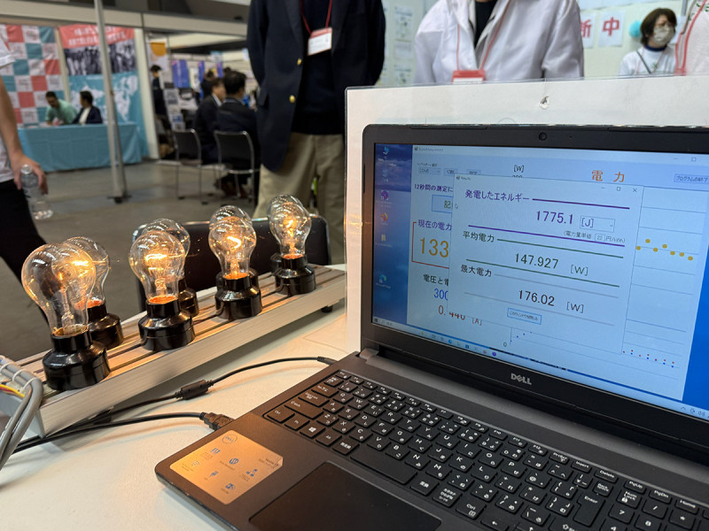 この装置の本来の用途は、発電した電気を蓄電池に接続して蓄電し、被災地や電源がないところで使用することですが、今回は「体験できる展示品」として、特別な企画を実施しました。